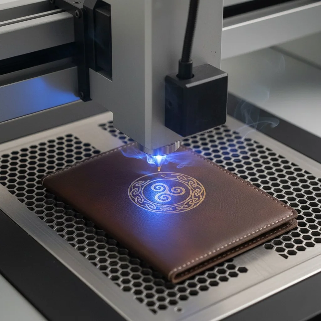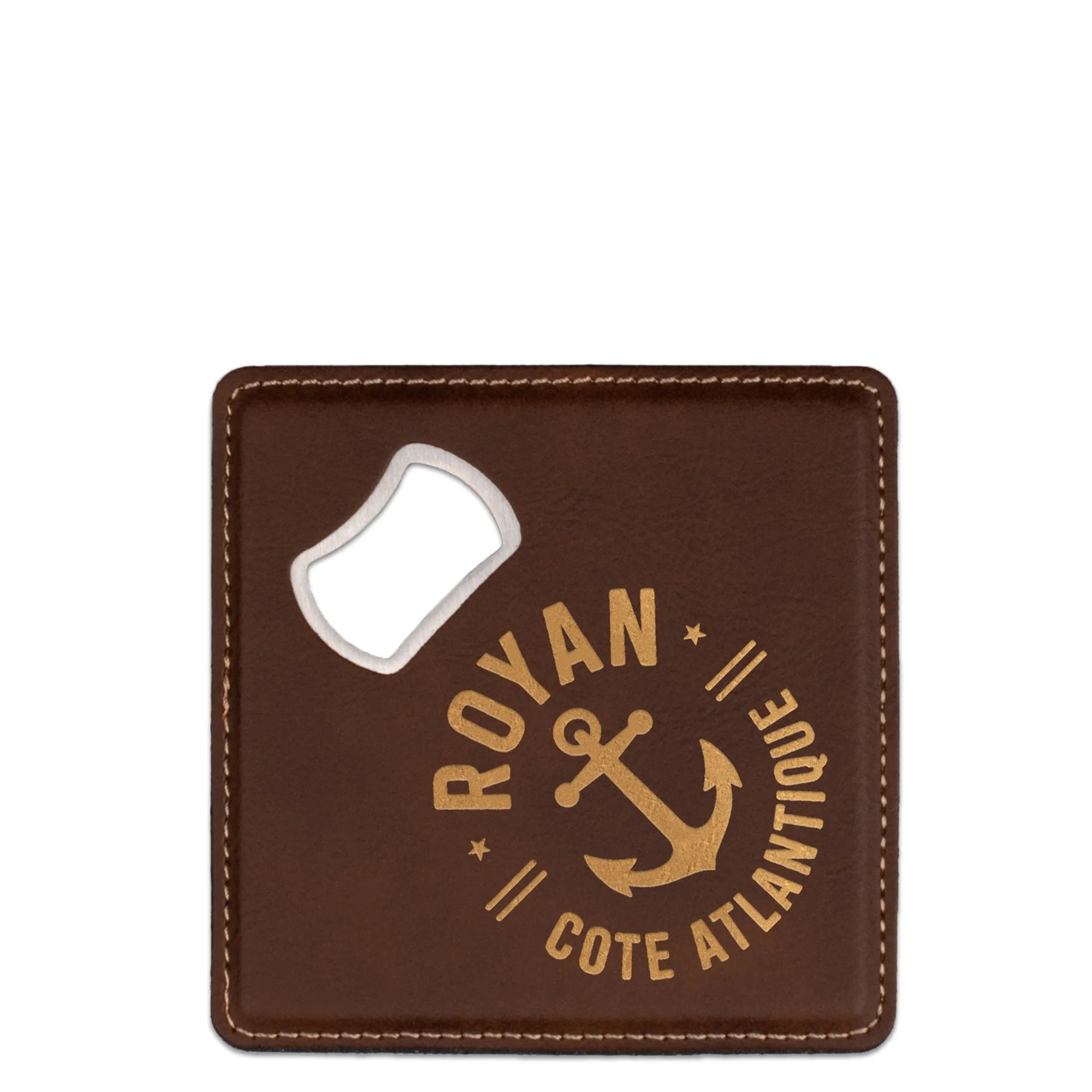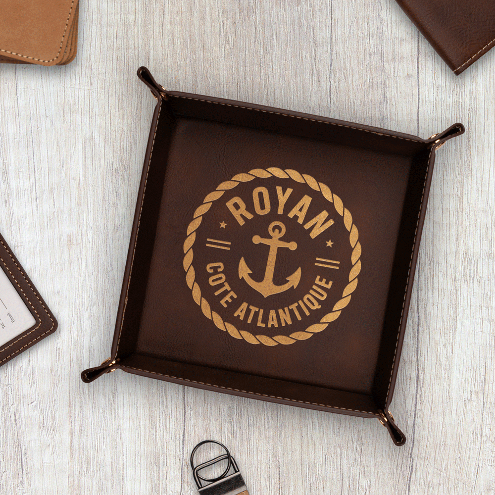 Nous utilisons un matériau exclusif, sans matière animale, qui imite parfaitement l’aspect du cuir. Ce support, associé à notre gravure laser, garantit un rendu qualitatif, net et durable.