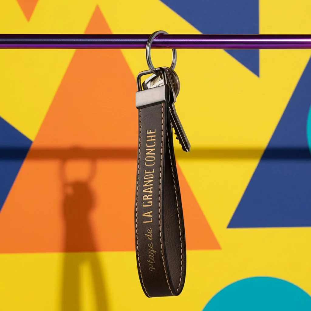 Vous y verrez une sélection de designs adaptés à votre destination (monuments, symboles, paysages…), appliqués directement sur notre gamme de produits : porte-clés, vide-poches, porte-passeports, etc. Vous pouvez ainsi visualiser immédiatement le rendu final en boutique.